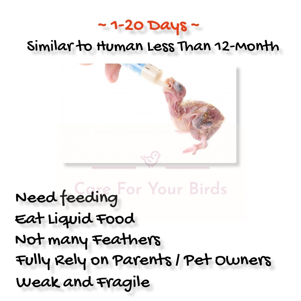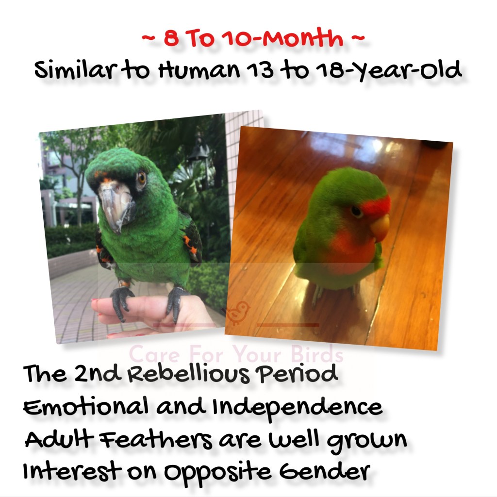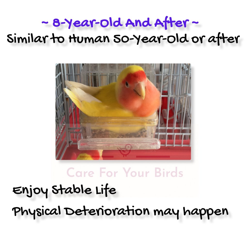 We usually consider 1 year for dog equals to 7 years for you. Similar to dogs, birds’ age should be viewed relative to its life span. Different bird species have different life span. Grey parrots have an average life span of 50 years, lovebirds have 10-15 years. I am using a bird with about 20 years’ life span as an example to show you how to estimate its age in human years. You can then estimate your birds’ in human years by proportion.