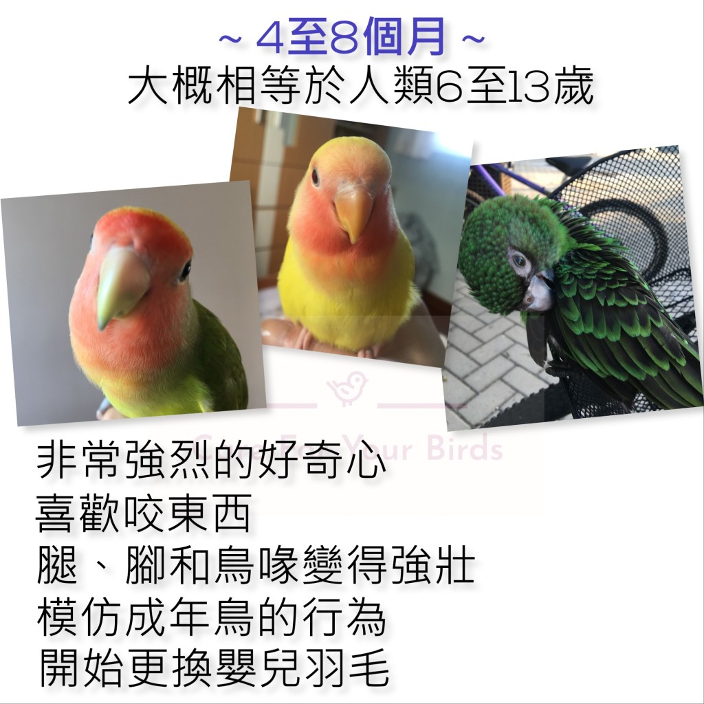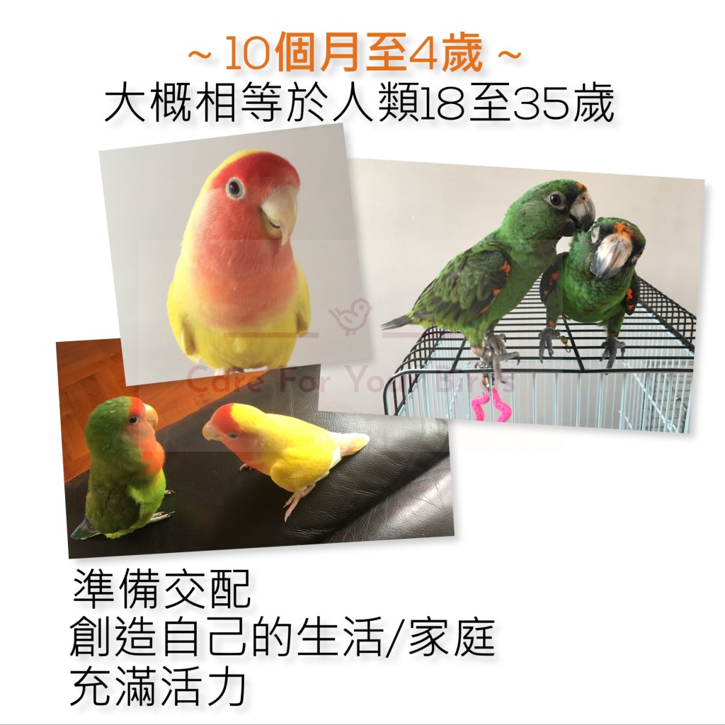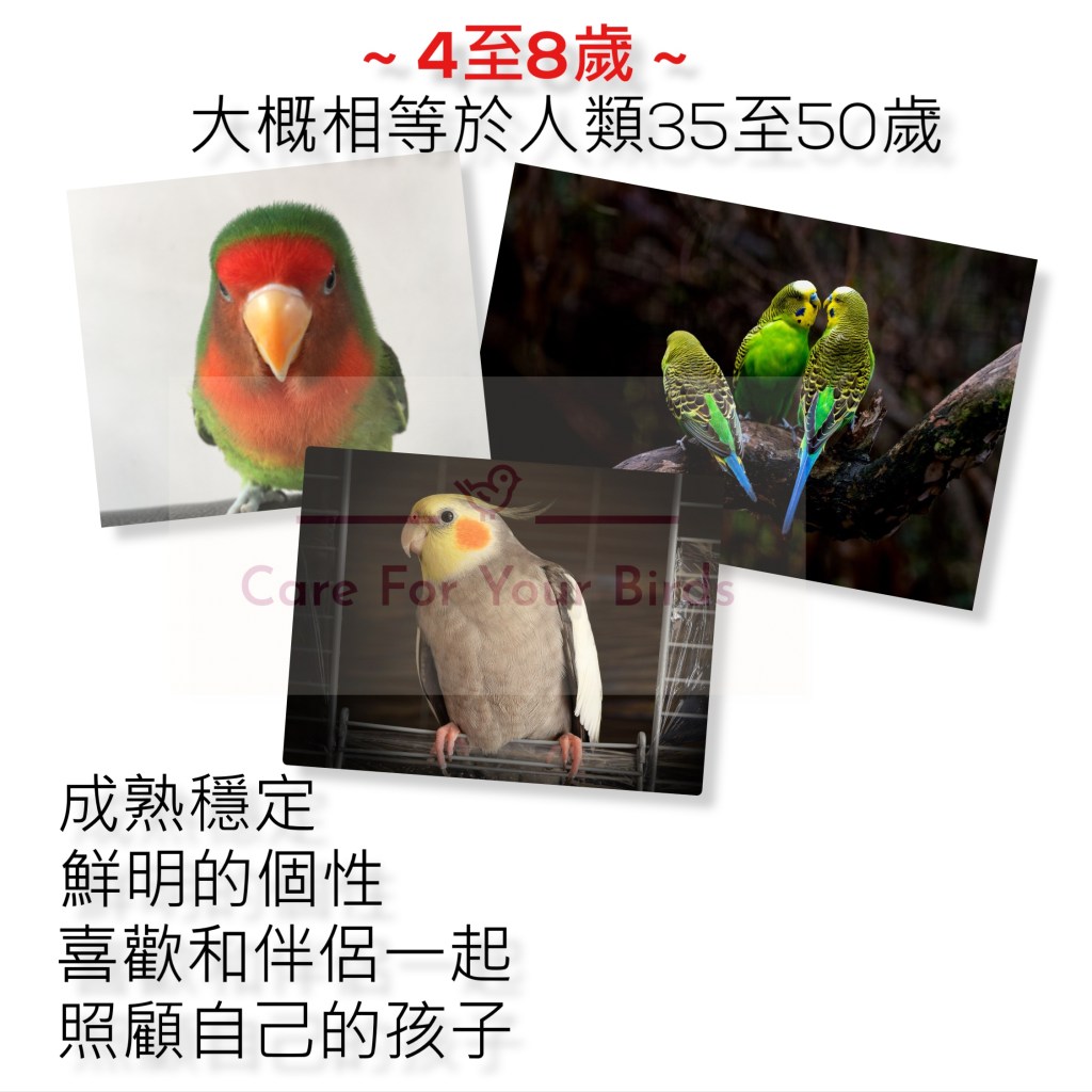 我們一般認為狗的1歲大約等於人類7歲。 同樣地,雀鳥的歲數亦相對於牠的生命期。 不同品種的鳥類有不同的生命期。灰鸚鵡平均壽命有50歲,愛情鳥平均壽命有10-15歲。以下我用一隻生命期約為20年的雀鳥來估計牠的人類歲數。你可按比例估計出你的雀鳥的人類歲數 。