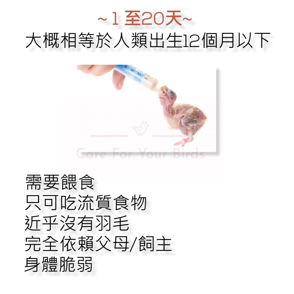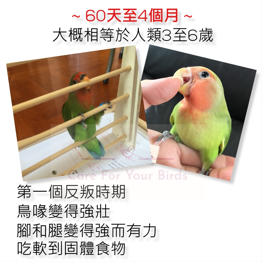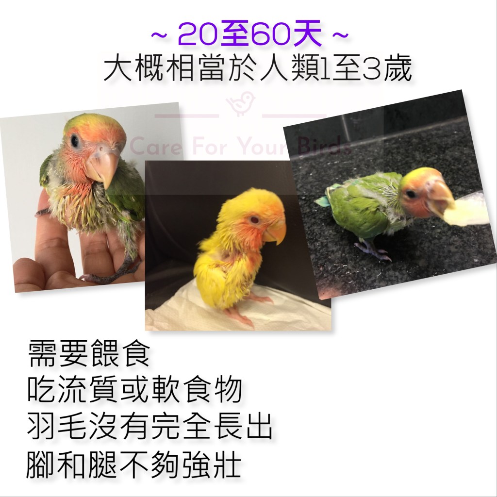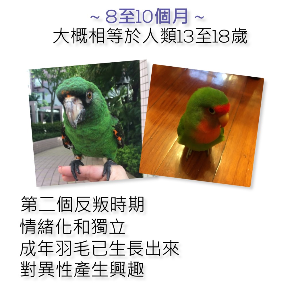 我們一般認為狗的1歲大約等於人類7歲。 同樣地,雀鳥的歲數亦相對於牠的生命期。 不同品種的鳥類有不同的生命期。灰鸚鵡平均壽命有50歲,愛情鳥平均壽命有10-15歲。以下我用一隻生命期約為20年的雀鳥來估計牠的人類歲數。你可按比例估計出你的雀鳥的人類歲數 。