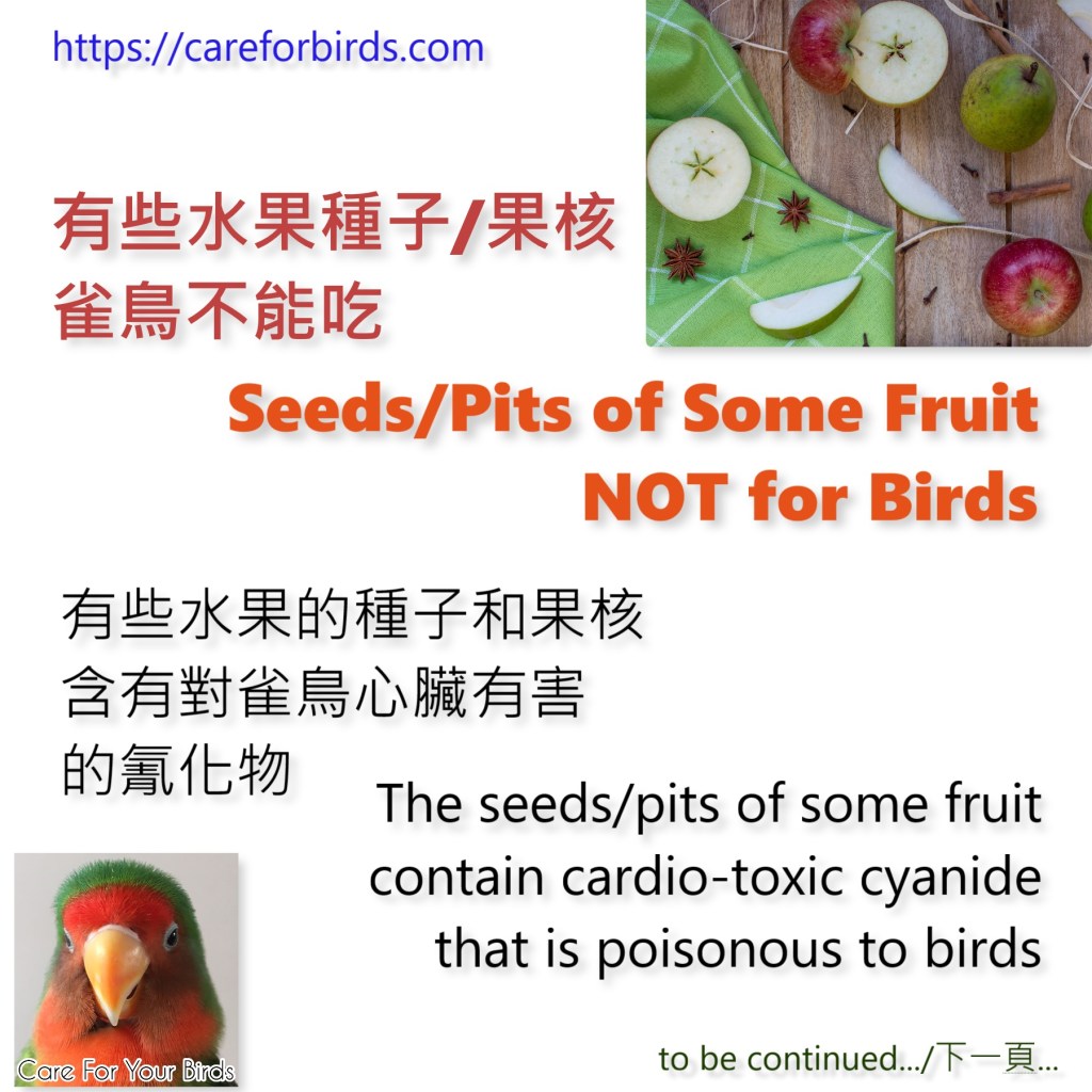 Most of the fruits are safe for your birds, but the seeds/pits of some fruits (rose family) like apples, cherries, peaches, plums, apricots, pears, can be toxic to birds that can even cause poisoning.