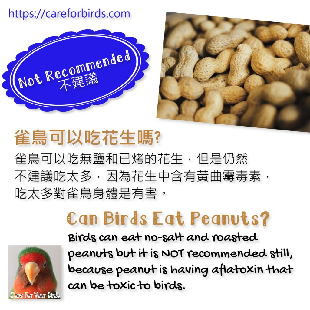 Peanuts are rich in protein and vitamin E, they even have some “healthy” fats. Although birds can eat peanuts (cooked/roasted and no-salt), it is not recommended to feed too much to birds because peanuts contain aflatoxin. Eating too much aflatoxin can increase the incidence of liver cancer.